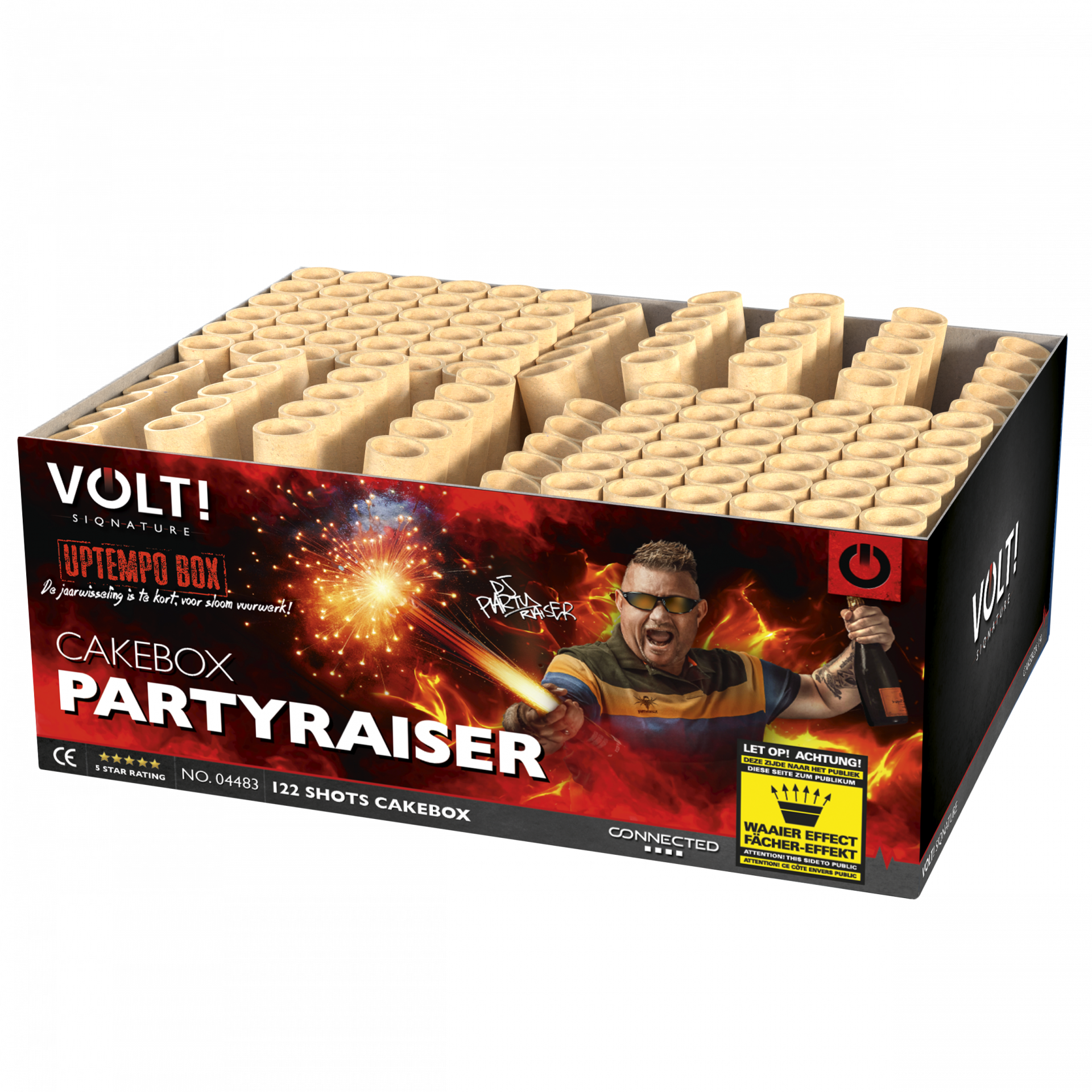 Speciaal ontwikkeld door de bekende Hardcore DJ. Deze 122 schots bak verandert van I-shape naar fanshape naar I-shape en weer naar fanshape! En dit in een moordend tempo met keiharde salvo's en dikke Thunders! Dikke gouden boeketten met prachtige kleuren wisselen elkaar af. De finale met een dubbel kleurensalvo is weergaloos! De jaarwisseling is te kort voor sloom vuurwerk! Gas erop!